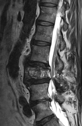 Stenose des Spinalkanals durch Destruktion des 3. Lendenwirbels (Morbus Paget) und Bandscheibenprotrusion L4/5. Zusätzliche Einengung des Spinalkanals durch knöcherne Anbauten an den Wirbelbögen und Gelenkfacetten.
