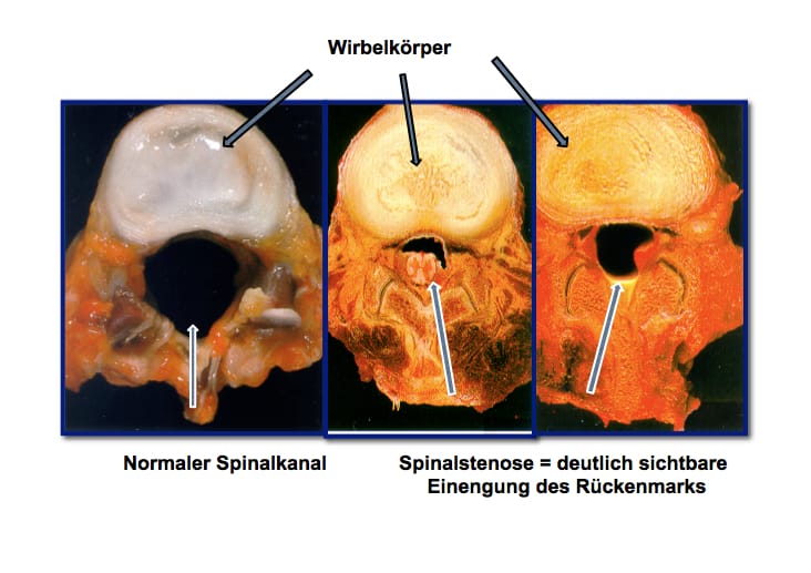 Verschleißerscheinungen an der Wirbelsäule stimulieren die Selbstheilungskräfte in unserem Körper. Der Körper reagiert mit dem Anbau von Knochengewebe, welches die Wirbel untereinander stützen und stabilisieren soll. Häufig führen diese Knochenanbauten zu einer Arthrose der Facettengelenke sowie Verengungen des Spinalkanals und der Nervenöffnungen (Foramina). Die Folge sind starke Rückenschmerzen (Lumbago), Bewegungseinschränkungen und ausstrahlende Schmerzen ( Lumbo-Ischialgie), welche unter Umständen zu Lähmungserscheinungen führen können. Man spricht – wie bei der durch gefäßbedingte Durchblutungsstörungen verursachten «Schaufensterkrankheit» – von einer «Claudicatio spinalis».